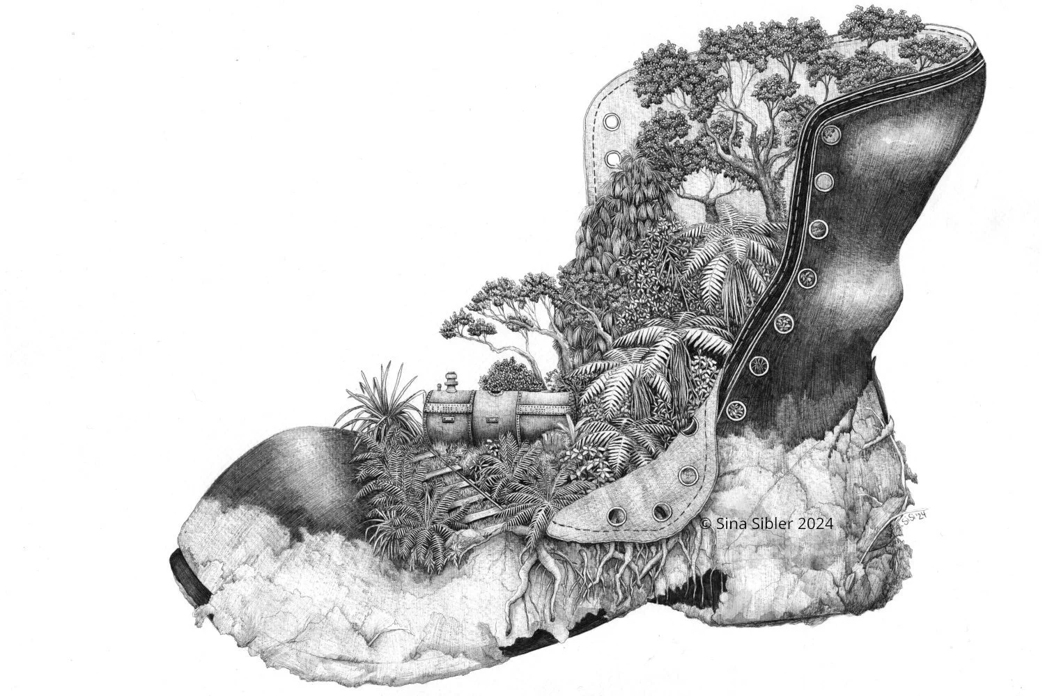 Walking here feels like moving through layers of time. I wanted my drawing to capture that sense of memory and transformation. The boot stands as proof that even our footprints can become part of the wild landscape they once disturbed.