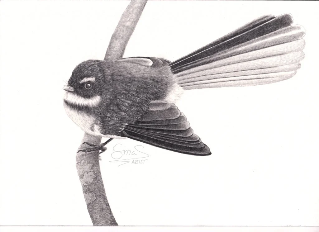 Fantail Study 18 celebrates the lively charm and energetic spirit of the New Zealand fantail (pīwakawaka). Perched lightly on a branch, this small native bird is shown mid-curious glance, its delicate feathers and expressive tail captured in detailed graphite.