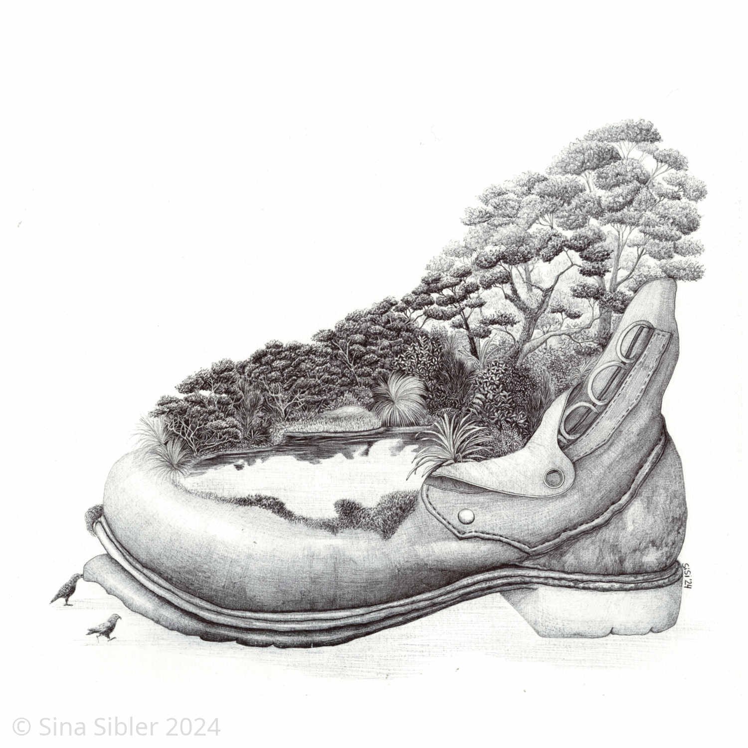 This ballpoint pen drawing captures the unique beauty of New Zealand’s Fiordland, inspired by the Key Summit Track. An old boot, weathered by time and nature, cradles vibrant native vegetation - tussocks, beech trees, flaxes - symbolizing the resilience of life in the wild. Three playful kea, mischievous and curious, nibble at the leather tongue, embodying the spirited wildlife often encountered along the trail.