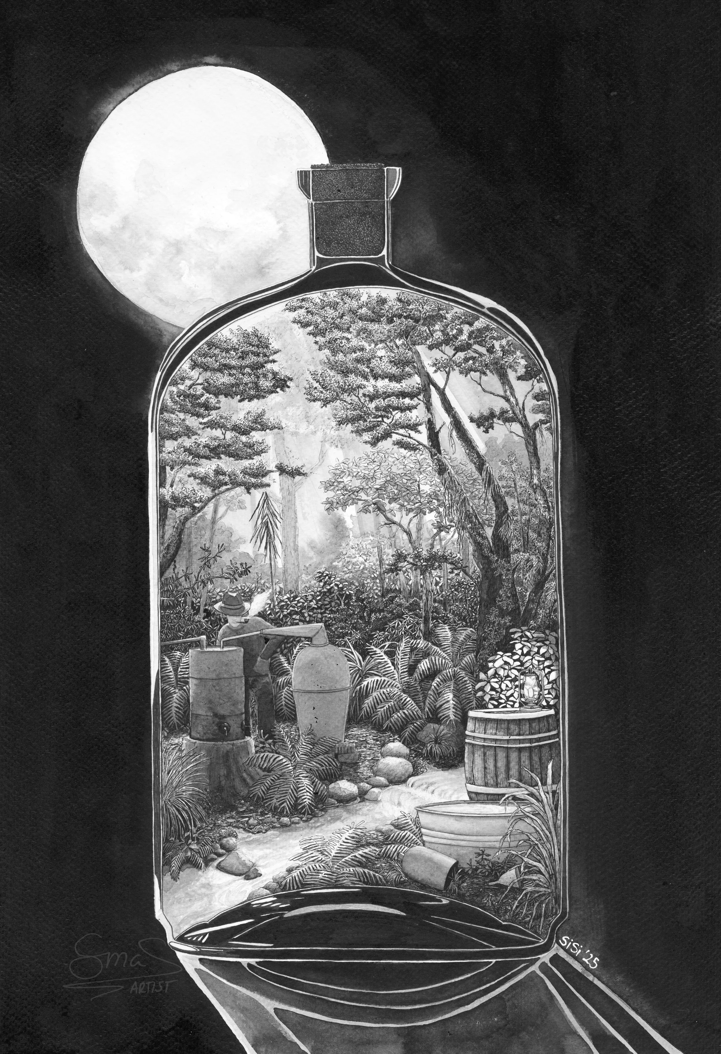 Still of the Night is a quiet tribute to the hidden past of the Hokonui Hills, once a refuge for bootleggers who brewed moonshine deep in the bush. The scene takes shape inside a glass flask, glowing with moonlight and mystery - a copper still, a watchful figure, a creek winding past scattered barrels. This drawing isn’t a literal retelling of history, but a glimpse into its atmosphere. It captures the hush of night, the flicker of firelight, and the ever-present moon standing guard overhead. A moment suspended in time, where the stillness carries whispers of the land’s untold stories.