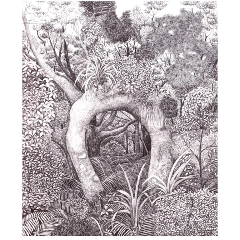 This drawing, created entirely in ballpoint pen, captures both the wild character of the tree and the atmosphere of the island itself - windswept, resilient, and alive with stories. To me, the tree is more than a shape in the landscape; it is a threshold into the mysteries of Fiordland’s untouched beauty.
