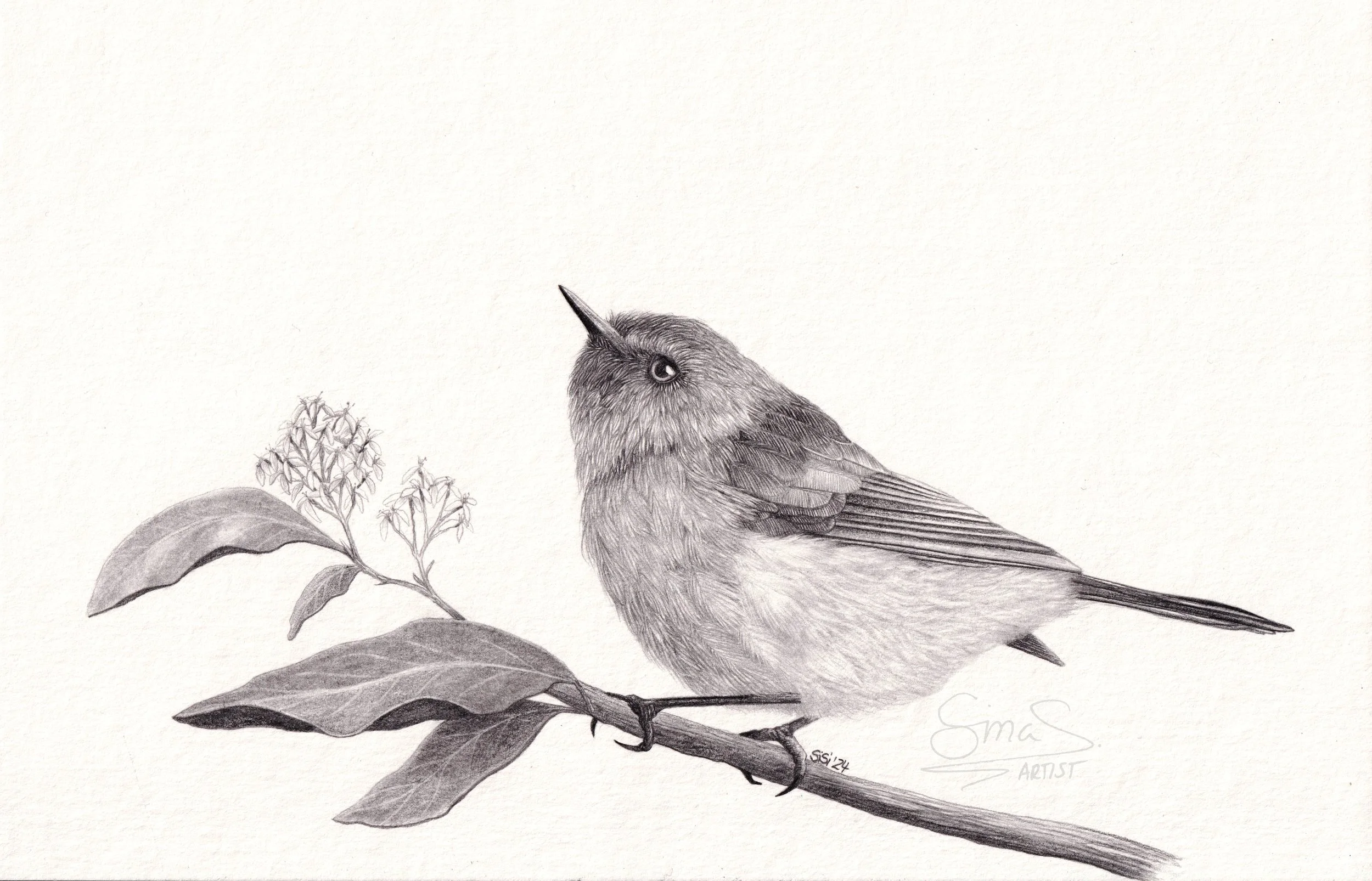 Warbler on Olearia captures a tender moment in the native New Zealand bush - a grey warbler perched lightly among the branches of an Olearia shrub. These tiny birds are often heard before they’re seen, their silvery song threading through the forest. The drawing reflects the quiet strength and delicacy of New Zealand’s native life, fleeting, yet deeply rooted in the landscape.