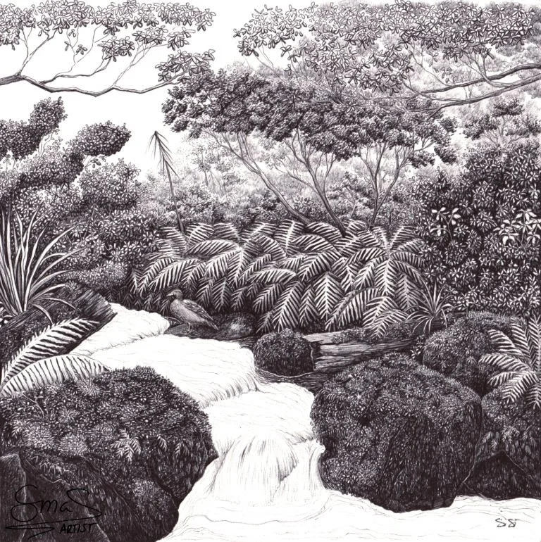 Drawn with a single ballpoint pen, this piece captures the fluid movement of the water and the subtle strength of the whio, a bird perfectly adapted to fast-flowing alpine torrents. With strong legs and sharp claws, whio cling to slippery rocks as they forage, often blending seamlessly into the stony surrounds.